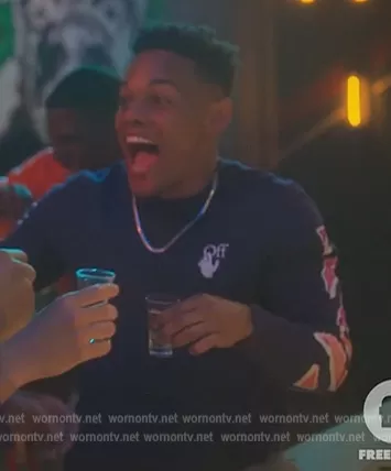 (played by ) on Grown-ish on Freeform was spotted wearing this Blue off white long sleeve tee on Grown-ish on episode 'Look What U Started' (5x04) in Aug 2022. 's Shirt is the Marker Long Sleeve T-shirt by Off White.