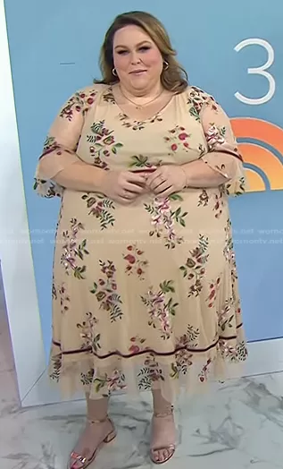 on Today on NBC was spotted wearing this beige floral dress on Today on Aug 11 2022's episode. 's Dress is the Wildflower Embroidered Dress by Kiyonna.