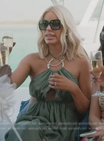 Caroline Stanbury (played by Caroline Stanbury) on The Real Housewives of Dubai on BravoTV was spotted wearing this gray ring embellished maxi dress on The Real Housewives of Dubai on episode 'Girls Trippin'' (1x10) in Aug 2022. Caroline's Dress is the Aphrodite Cutout Silk Dress by Cult Gaia.