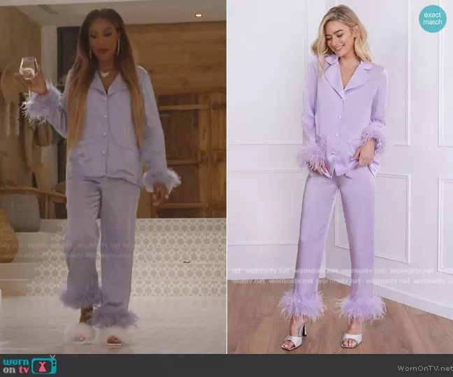 Caroline Brooks (played by Caroline Brooks) on The Real Housewives of Dubai on BravoTV was spotted wearing this lavender feather trim pajamas on The Real Housewives of Dubai on episode 'Girls Trippin'' (1x10) in Aug 2022. Caroline B's Pajamas is the Darcie Lilac Pajamas by Nadine Merabi.