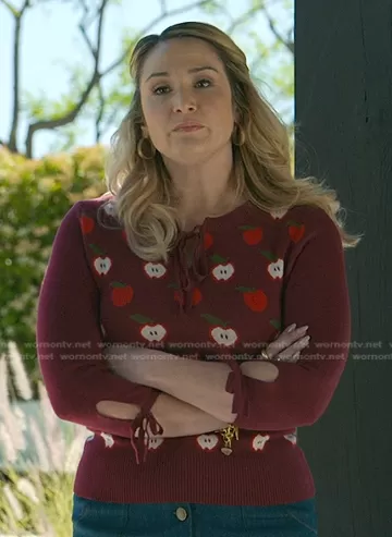 Davia (played by Emma Hunton) on Good Trouble on Freeform was spotted wearing this burgundy apple print sweater on Good Trouble on episode 'You Know You Better Watch Out' (4x15) in Aug 2022. Davia's Sweater is the Burgundy & Apple Print Swoosie Sweater by Unique Vintage.