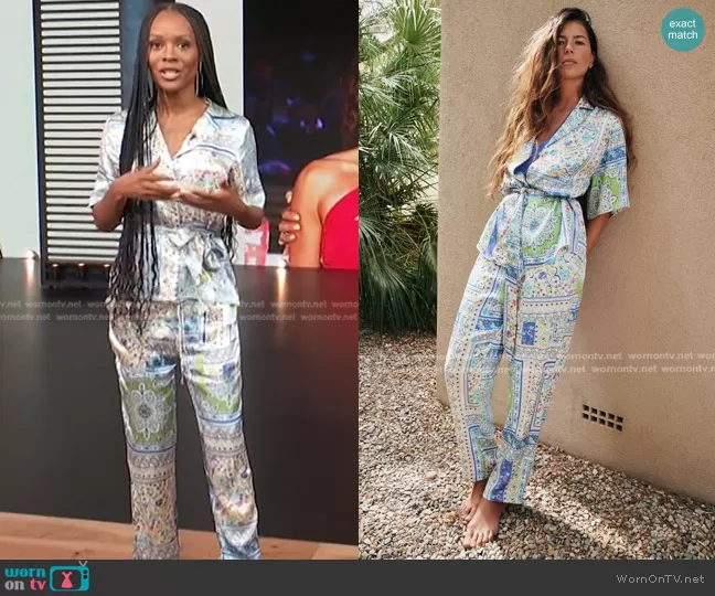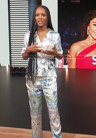 Zuri Hall on Access Hollywood on NBC was spotted wearing this printed wrap blouse and pants on Access Hollywood on Aug 12 2022's episode. Zuri's Top is the Belted Print Blouse by Zara . Zuri's Pants is the Printed Pants by Zara.