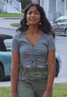 Devi Vishwakumar (played by Maitreyi Ramakrishnan) on Never Have I Ever on Netflix was spotted wearing this gray ruched front top on Never Have I Ever on episode 'Made Someone Jealous' (3x04) in Aug 2022.