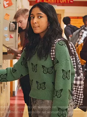 Devi Vishwakumar (played by Maitreyi Ramakrishnan) on Never Have I Ever on Netflix was spotted wearing this green butterfly pattern sweater on Never Have I Ever on episode 'Made Someone Jealous' (3x04) in Aug 2022. Devi's Sweater is the Butterfly Pattern Sweater by Romwe.