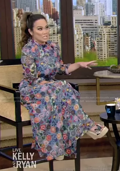on Live with Kelly and Mark on Disney ABC Home Entertainment was spotted wearing this Dr. Pimple Popper Sandra Lee’s blue flora maxi dress on Live with Kelly and Ryan on Aug 15 2022's episode. 's Dress is the Jacqui B Dress by Saloni . 's Shoes is the Riva Butterfly Espadrille Platform Sandals by Sophia Webster.
