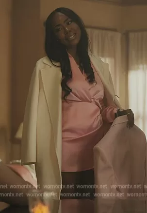(played by Nia Jervier Carolyn) on The Chi on ShowTime was spotted wearing this pink satin wrap mini dress on The Chi on episode 'Sweet Thing' (5x08) in Aug 2022. 's Dress is the Short Satin Dress by Zara.