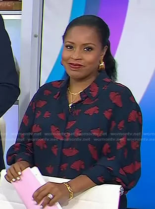 Sheinelle Jones on Today on NBC was spotted wearing this navy and red floral print blouse on Today on Aug 15 2022's episode. Sheinelle's Top is the Gingko Print Blouse by Jason Wu.