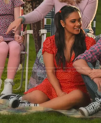 Haley Garcia (played by Alex Felix) on Never Have I Ever on Netflix was spotted wearing this red floral mini dress on Never Have I Ever on episode 'had my own troll' (3x02) in Aug 2022. 's Shoes is the Classic Old Skool Sneakers by Vans.