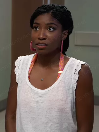 Trina Robinson (played by Tabyana Ali) on General Hospital on ABC was spotted wearing this whit crochet trim tank on General Hospital on Aug 16 2022's episode. Trina's Top is the Chrissy Linen Tank Top by Paige.