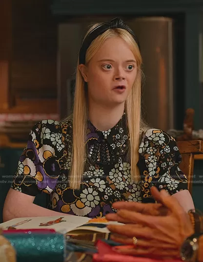 Rebecca (played by Lily D. Moore) on Never Have I Ever on Netflix was spotted wearing this black floral dress on Never Have I Ever on episode 'had my own troll' (3x02) in Aug 2022. 's Dress is the Saskiie Floral Dress by Ted Baker.