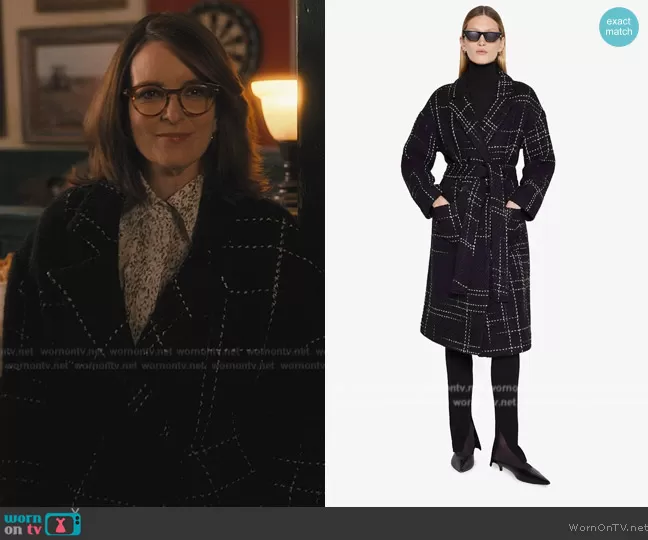 (played by Tina Fey) on Only Murders in the Building on Hulu was spotted wearing this black check coat on Only Murders in the Building on episode 'Sparring Partners' (2x09) in Aug 2022. 's Coat is the Norma Coat by Anine Bing.