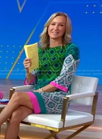 Lara Spencer on Good Morning America on ABC was spotted wearing this multicolor geometric print shift dress on Good Morning America on Aug 16 2022's episode. Lara's Dress is the Geometric Shift Dress by Eliza J.