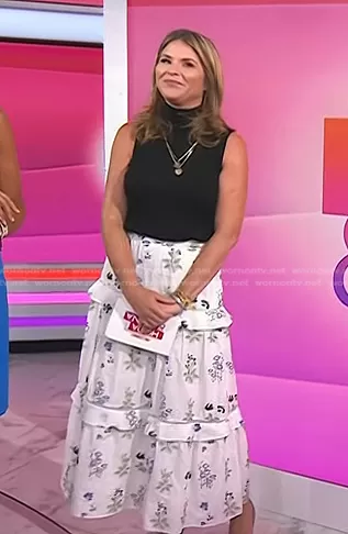 Jenna Bush Hager on Today on NBC was spotted wearing this white floral tiered skirt on Today on Aug 16 2022's episode. Jenna's Skirt is the Floral Voile Tiered Skirt by Pearl by Lela Rose.