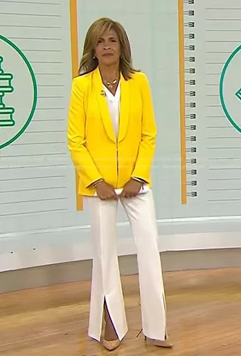 Hoda Kotb on Today on NBC was spotted wearing this yellow blazer and white front slit pants on Today on Aug 17 2022's episode. Hoda's Jacket is the Skye Blazer by Alice + Olivia . Hoda's Pants is the Walker Slim Front Slit Pants by Alice + Olivia.