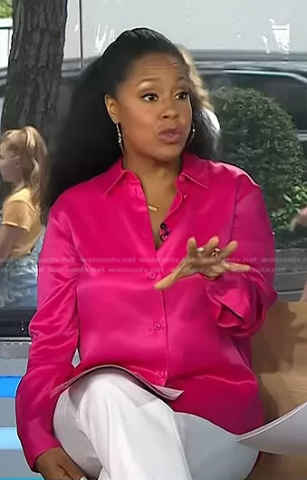 Sheinelle Jones on Today on NBC was spotted wearing this fuchsia pink satin blouse on Today on Aug 17 2022's episode. Sheinelle's Top is the Satin Effect Shirt by Zara.