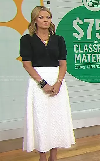 Savannah Guthrie on Today on NBC was spotted wearing this black v-neck top and white textured skirt on Today on Aug 17 2022's episode. Savannah's Top is the Heather Ribbed T-Shirt by Derek Lam 10 Crosby . Savannah's Skirt is the Embroidered Eyelet Midi-Skirt by Lela Rose.