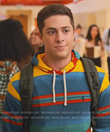 (played by Jaren Lewison) on Never Have I Ever on Netflix was spotted wearing this rainbow stripe hoodie on Never Have I Ever on episode 'Had an Indian Boyfriend' (3x09) in Aug 2022. 's Sweater is the Striped Spa Terry Hoodie by Polo Ralph Lauren.