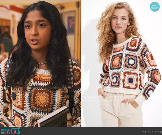 Devi Vishwakumar (played by Maitreyi Ramakrishnan) on Never Have I Ever on Netflix was spotted wearing this crochet knit sweater on Never Have I Ever on episode 'Had an Indian Boyfriend' (3x09) in Aug 2022. Devi's Sweater is the Crochet Sweater by American Eagle.