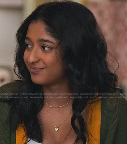 Devi Vishwakumar (played by Maitreyi Ramakrishnan) on Never Have I Ever on Netflix was spotted wearing this heart necklace on Never Have I Ever on episode 'hooked up with my boyfriend' (3x08) in Aug 2022. Devi's Necklace is the The Love Lock Necklace by Hyperbole Accessories.