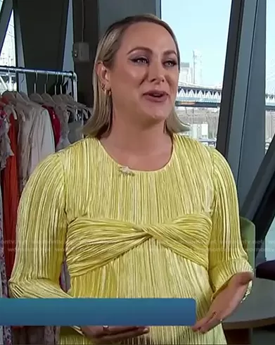 on Access Hollywood on NBC was spotted wearing this yellow ribbed dress on Access Hollywood on Aug 17 2022's episode. 's Dress is the Plisse Twisted Dress by Marina Moscone.