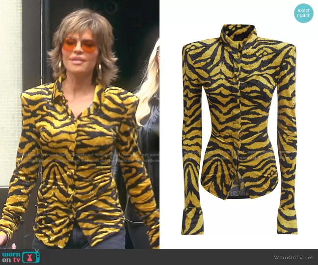 Lisa Rinna on The Real Housewives of Beverly Hills on Bravo was spotted wearing this yellow tiger print blouse on The Real Housewives of Beverly Hills on episode 'Disco Inferno' (12x15) in Aug 2022. Lisa's top is the Printed Button Up Top by The Attico.