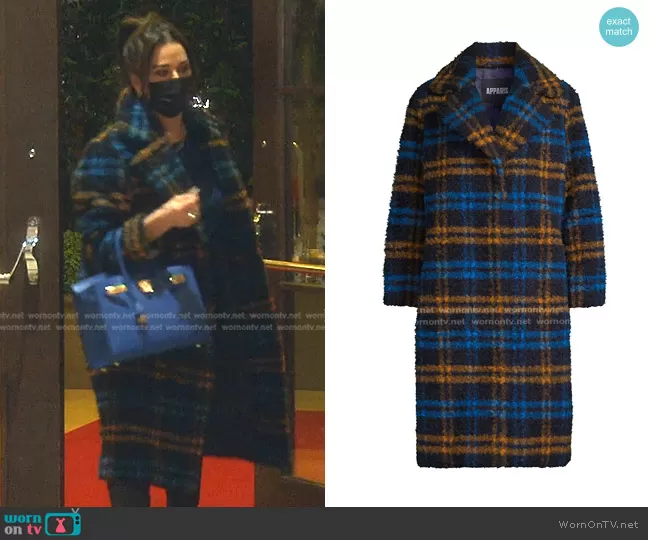 Kyle Richards on The Real Housewives of Beverly Hills on Bravo was spotted wearing this blue plaid coat on The Real Housewives of Beverly Hills on episode 'Disco Inferno' (12x15) in Aug 2022. Kyle's Coat is the Tikka Plaid Check-Pattern Coat by Apparis . Kyle's Bag is the Birkin 30 by Hermes.