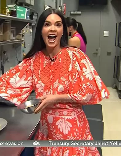 on Today on NBC was spotted wearing this orange floral top and skirt on Today on Aug 18 2022's episode. 's Top is the Neon Jungle Embroidered Blouse by Farm Rio . 's Skirt is the Jungle Mini Skirt by Farm Rio.