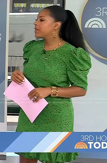 Sheinelle Jones on Today on NBC was spotted wearing this green floral dress on Today on Aug 30 2022's episode. Sheinelle's Dress is the Lila Dress by Veronica Beard.