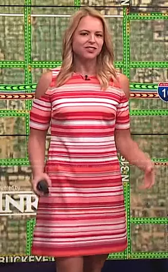 on Today on NBC was spotted wearing this pink striped cold shoulder dress on Today on Aug 18 2022's episode. 's Dress is the Off-The-Shoulder Striped Sheath Dress by Calvin Klein.
