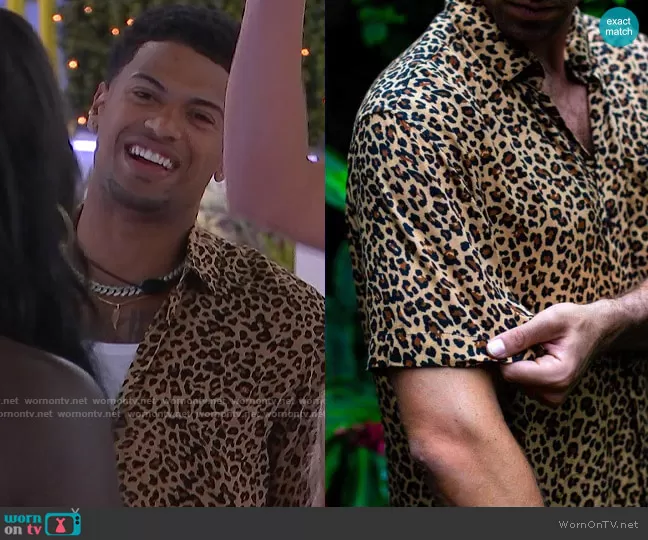 Timmy Pandolfi on Love Island USA on Peacock was spotted wearing this leopard print shirt on Love Island USA on Aug 18 2022's episode. Timmy's Shirt is the The Purradise Shirt by Kenny Flowers.