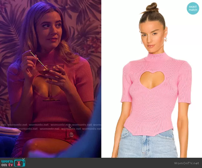 Kelly Beasley (played by Mallory Bechtel) on Pretty Little Liars Original Sin on HBO was spotted wearing this pink heart cutout top and crystal button skirt on Pretty Little Liars Original Sin on episode 'Chapter Eight: Bad Blood' (1x08) in Aug 2022. Kelly's Top is the Heart Cutout Knit Top by Fleur du Mal . Kelly's Skirt is the Penelope Mini Skirt by Majorelle.