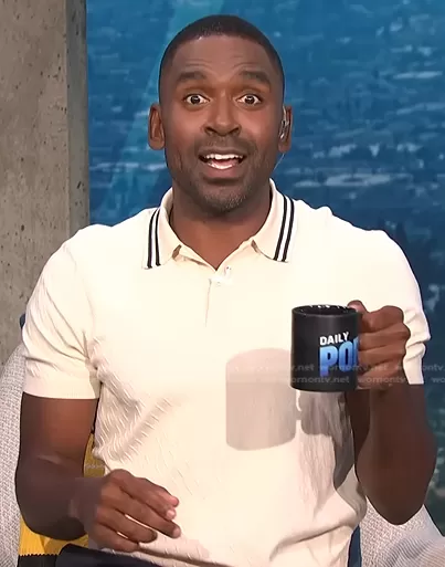 Justin Sylvester on E! News on E! was spotted wearing this Ivory textured polo shirt on E! News Daily Pop on Aug 19 2022's episode. Justin's Shirt is the Broch Solid Polo Shirt by Ted Baker.