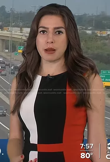 on Good Morning America on ABC was spotted wearing this white, black and red colorblock dress on Good Morning America on Aug 19 2022's episode. 's Dress is the Color Block Dress by Joseph Ribkoff.