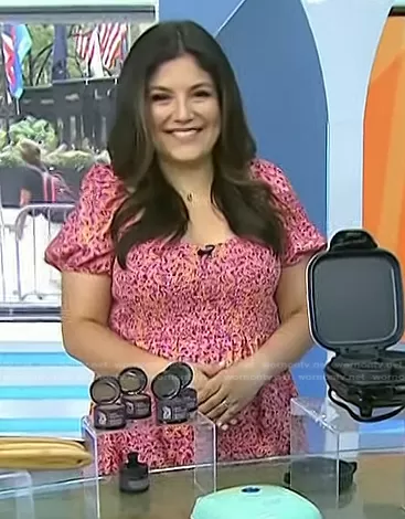 Adrianna Barrionuevo Brach on Today on NBC was spotted wearing this pink print smocked dress on Today on Aug 22 2022's episode. Adrianna's Dress is the Sunny Smocked Dress by Louna.