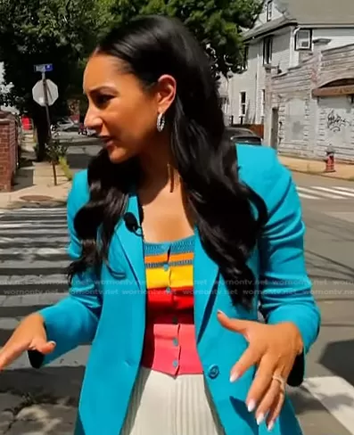 on Today on NBC was spotted wearing this Morgan Radford’s rainbow stripe top and blue blazer on Today on Aug 22 2022's episode. 's Top is the Daryn Stripe Button-Up Knit Tank Top by Alice + Olivia . 's Jacket is the Pailey Fitted Linen Blend Blazer by Alice + Olivia.
