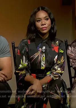 on Extra on Extra was spotted wearing this black floral print shirtdress on Extra on Aug 22 2022's episode. 's Dress is the Floral-Print Shirt Dress by Jason Wu.