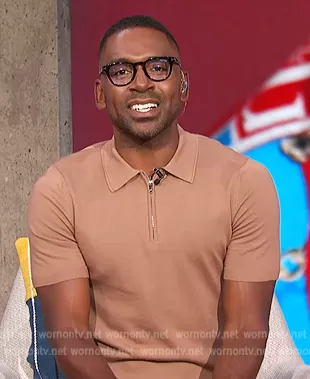 Justin Sylvester on E! News on E! was spotted wearing this khaki zip polo on E! News Daily Pop on Aug 25 2022's episode. Justin's Shirt is the Maxwell Zip Wool Polo by Reiss.