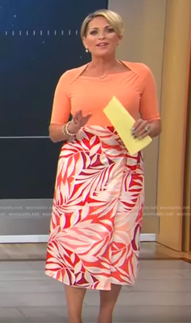 Jamie Yuccas on CBS Mornings on CBS was spotted wearing this orange top and leaf print skirt on CBS Mornings on Aug 25 2022's episode. Jamie's Top is the Refined Stretch Envelope Neck Top in Pale Clementine by Ann Taylor . Jamie's Skirt is the Tropical Sarong Wrap Midi Skirt in Tropical Coral by Ann Taylor .