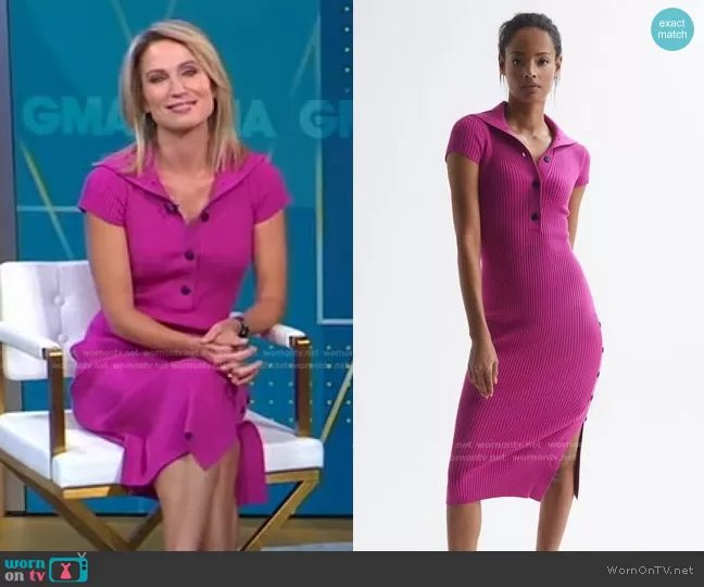 Amy Robach on Good Morning America on ABC was spotted wearing this pink ribbed polo dress on Good Morning America on Aug 26 2022's episode. Amy's Dress is the Mason Dress by Reiss.