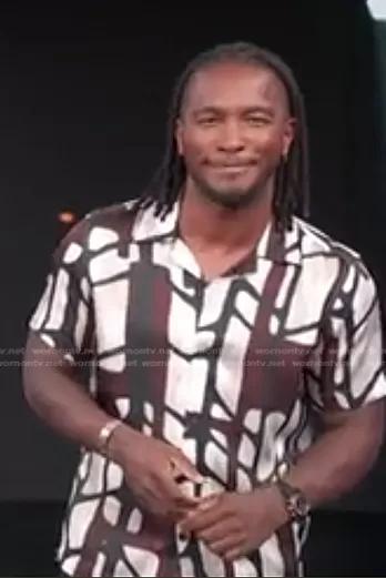 Scott Evans on Access Hollywood on NBC was spotted wearing this brown printed shirt on Access Hollywood on Aug 26 2022's episode. Scott's Shirt is the Rico Short Sleeve Button-Up Shirt by Reiss.