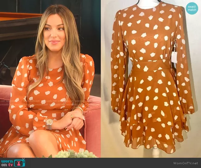 Alex Halll (played by Alex Hall) on Selling the OC on Netflix was spotted wearing this orange print chiffon dress on Selling the OC on episode 'Them Tables... They Turn' (1x02) in Aug 2022. Alex's Dress is the Polka Dot Tiered Dress by Forever 21.