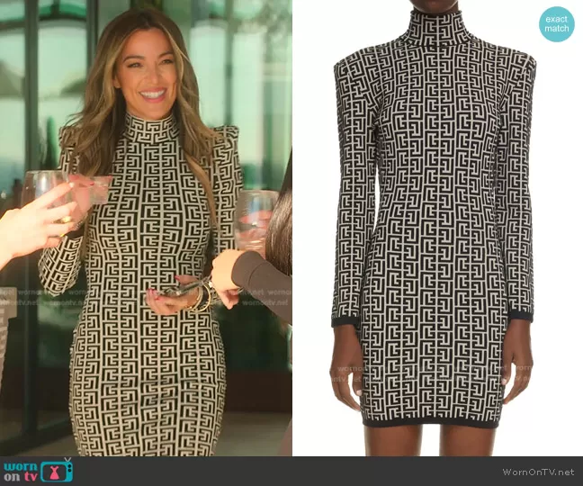 Alex Halll (played by Alex Hall) on Selling the OC on Netflix was spotted wearing this monogram mock neck dress on Selling the OC on episode 'Them Tables... They Turn' (1x02) in Aug 2022. Alex's Dress is the Monogram Jacquard Long Sleeve Wool Blend Minidress by Balmain.