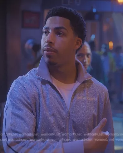 Andre Johnson, Jr. (played by Marcus Scribner) on Grown-ish on Freeform was spotted wearing this gray metallic track jacket and pants on Grown-ish on episode 'Love on the Brain' (5x07) in Sep 2022. Junior's Jacket is the Glitter lurex track jacket by Palm Angels . Junior's Pants is the Metallic Side-Stripe Track Pants by Palm Angels.