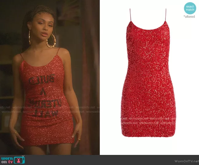 Kiela (played by Daniella Perkins) on Grown-ish on Freeform was spotted wearing this red glitter mini dress on Grown-ish on episode 'Love on the Brain' (5x07) in Sep 2022. Kiela's Dress is the Nelle Embellished Dress by Alice + Olivia.