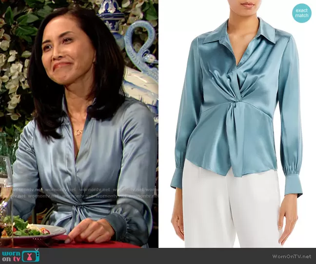 Li's choice of the Misha top in ocean dew by Cinq a Sept is a perfect example of her refined and sophisticated style. This elegant button-down blouse stands out with its unique twist detail in the middle, a design element that adds a contemporary edge to the classic silhouette. The luxurious satin fabric in light blue exudes serenity and class, making the blouse a versatile piece that can transition seamlessly from a day at the office to an evening event. The top's smooth texture and subtle sheen highlight Li's penchant for pieces that combine luxury with functionality. The Ocean Dew color adds a soft, calming touch to the ensemble, reflecting Li's understated yet impactful approach to fashion. This blouse is not just a garment; it's a statement of Li's understanding of the power of simplicity and the importance of fine details in creating an outfit that is both timelessly elegant and unmistakably modern.