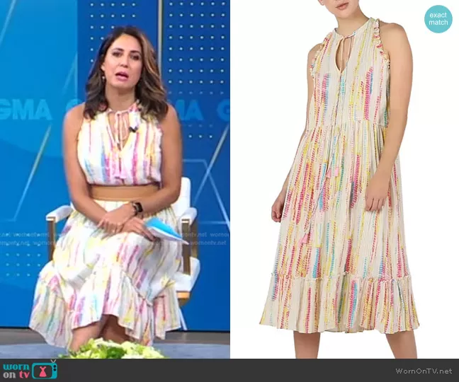 Cecilia Vega on Good Morning America on ABC was spotted wearing this multicolor tie neck midi dress on Good Morning America on Aug 31 2022's episode. Cecilia's Dress is the Printed Drawstring-Waist Dress by Black Tape.