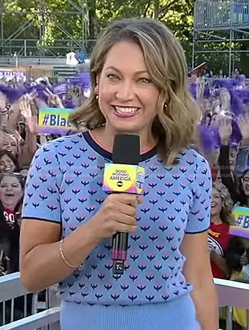 Ginger Zee on Good Morning America on ABC was spotted wearing this blue tulip print knit top on Good Morning America on Sep 02 2022's episode. Ginger's Sweater is the Jacquard Pink Tulip Sweater by Draper James.