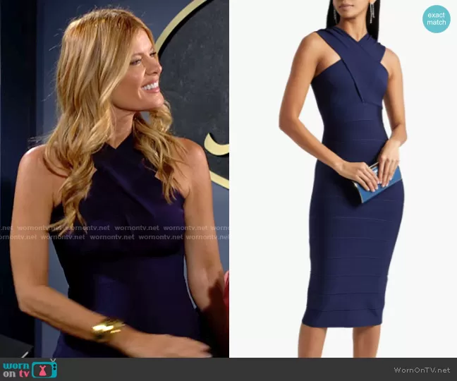 Phyllis Summers (played by Michelle Stafford) on The Young and the Restless on CBS was spotted wearing this navy cross-neck bandage dress on The Young and the Restless on Sep 02 2022's episode. Phyllis's Dress is the Crossover bandage dress by Herve Leger.