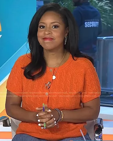 Sheinelle Jones on Today on NBC was spotted wearing this orange cable knit short sleeve top on Today on Sep 02 2022's episode. Sheinelle's Top is the Cashmere Cable-Knit Henley T-shirt by J. Crew.