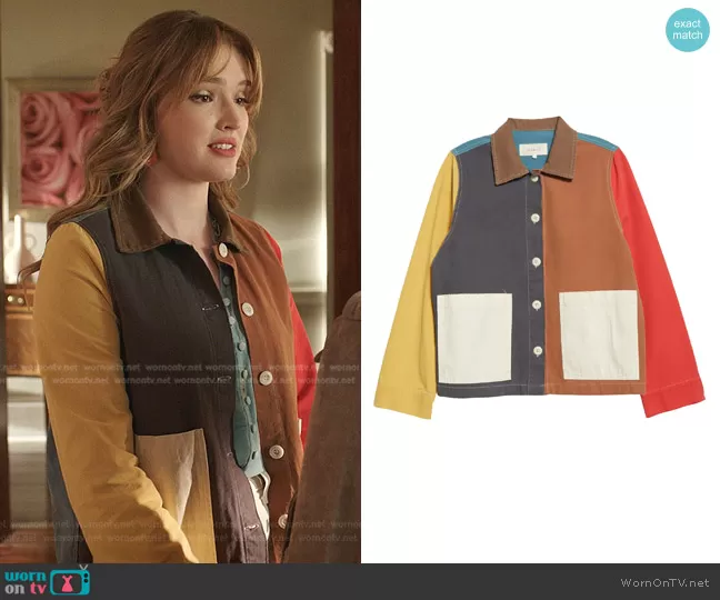 Kirby Anders (played by Maddison Brown) on Dynasty on The CW was spotted wearing this colorblock jacket on Dynasty on episode 'First Kidnapping and Now Theft' (5x20) in Sep 2022. Kirby's Jacket is the The Chore Patchwork Coat by The Great.